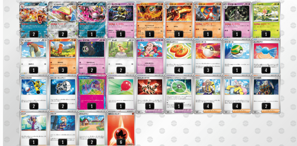 悪リザードンexデッキは、特性「れんごくしはい」による一度の進化で基本炎エネルギーを3枚加速できる、展開力に優れた構成です。