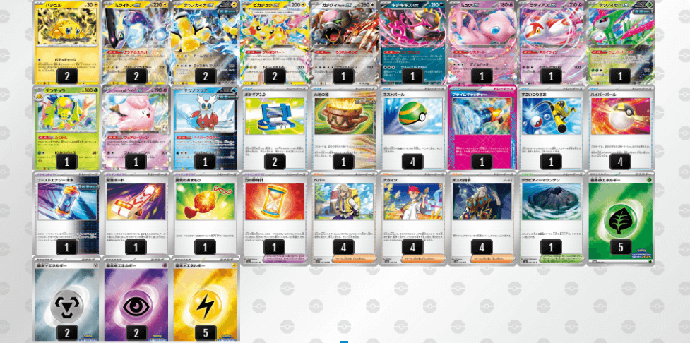 主力アタッカーや序盤に動けるたねポケモン、補助役をバランスのよい採用が、安定したデッキ構築には欠かせません。